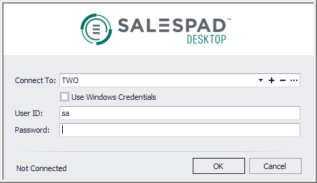 At the Login screen, click the “+” and check to make sure the current Connections within SalesPad are correct: