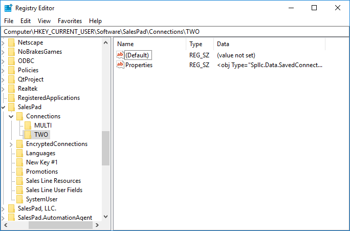 - The Registry Editor opens. Navigate to HKEY_CURRENT_USER > Software > SalesPad > Connections to find the connection key entries
