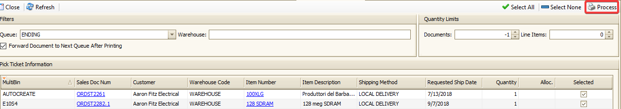 - Click the Process button to print pick tickets. All items that are not grayed out on the list will be processed.
