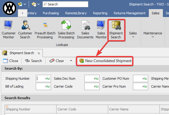 The Consolidated Shipments module is located in the Shipment Search screen, which can be found in the Sales module.