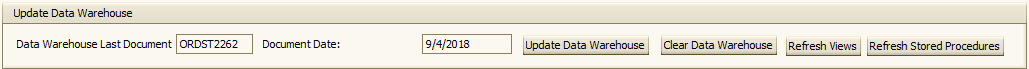 Update Data Warehouse allows a user to store any new data that has been created since the previous Data Warehouse update. This process can take a long time to complete, so it is suggested you run this when there are no users on the system. The Data Warehouse is used in Sales Analysis and is a more efficient way of storing historical data. To use it, simply click the Update Data Warehouse button.