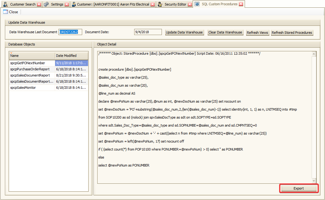 This pane will display the selected Database Object. It only allows user to view it, not to edit it. You can export SQL objects either to create a backup or to modify and then apply the updated export to the company database in SQL. To do this, click on the Export button.