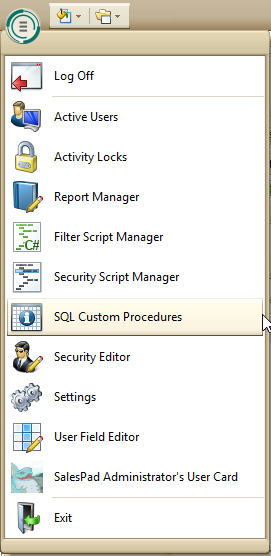 Log in to SalesPad, then click the SalesPad logo in the top left of the screen. The dropdown will have a SQL Custom Procedures option. Click on that to open the module.