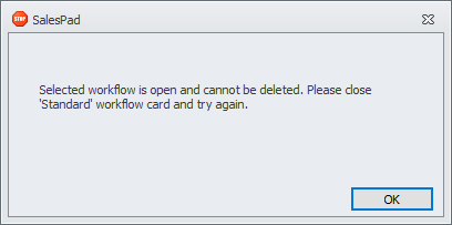 Note: Workflow cannot be deleted from the Workflow Setup screen if the Workflow Card for that workflow is currently open in SalesPad.