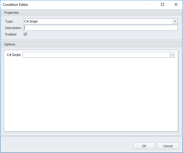 The C# script is the most versatile condition type. It allows the user to write complex conditions in the form of an executable script. The available script parameters are: