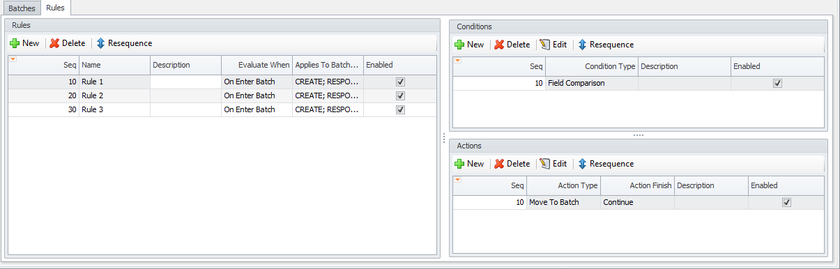 The Rules tab is split into three separate sections - Rules, Conditions, and Actions. To add a new rule, click the New button.