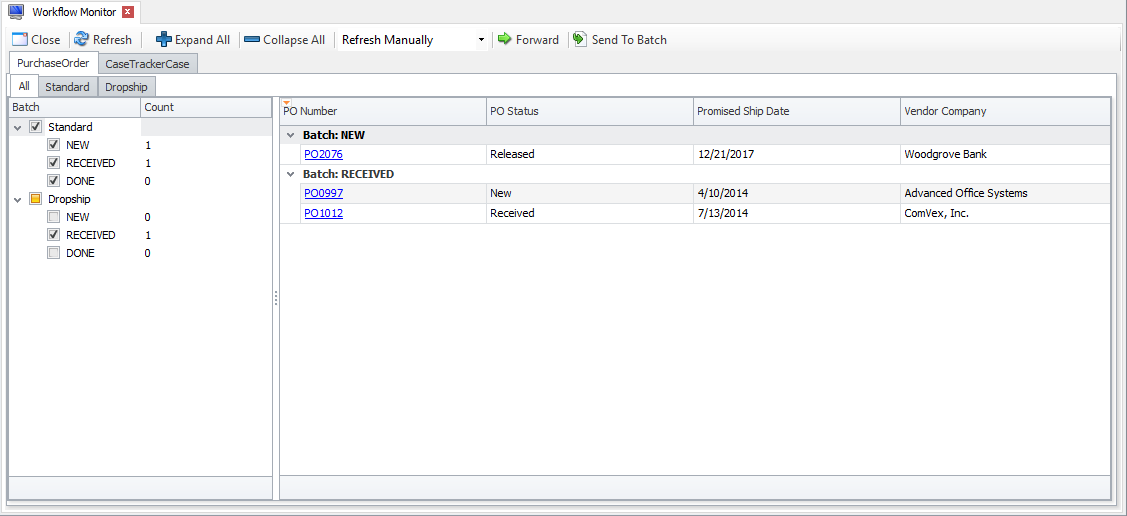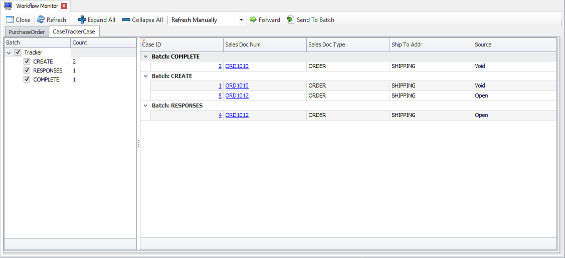 The Workflow Monitor screen has a tab for each business object, such as PurchaseOrder and CaseTrackerCase. Every business object tab has a sub-tab for each workflow. If business object does not support multiple workflows, sub-tabs will not be shown. For example, CaseTrackerCase business object does not support multiple workflows.