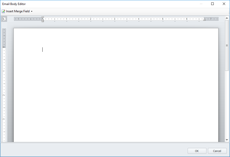 Email Body Editor is similar to the Email Template Editor in terms of functionality. The user can type the email body text and even insert merge fields by clicking the Insert Merge Field button.