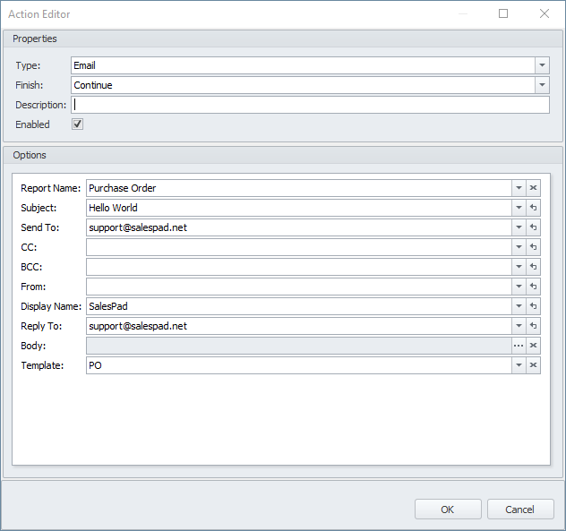 Email action is used to send email messages. Email settings will need to be configured in SalesPad before this action can be used. Please see the Settings section of the Emailing in SalesPad Desktop documentation for more information.