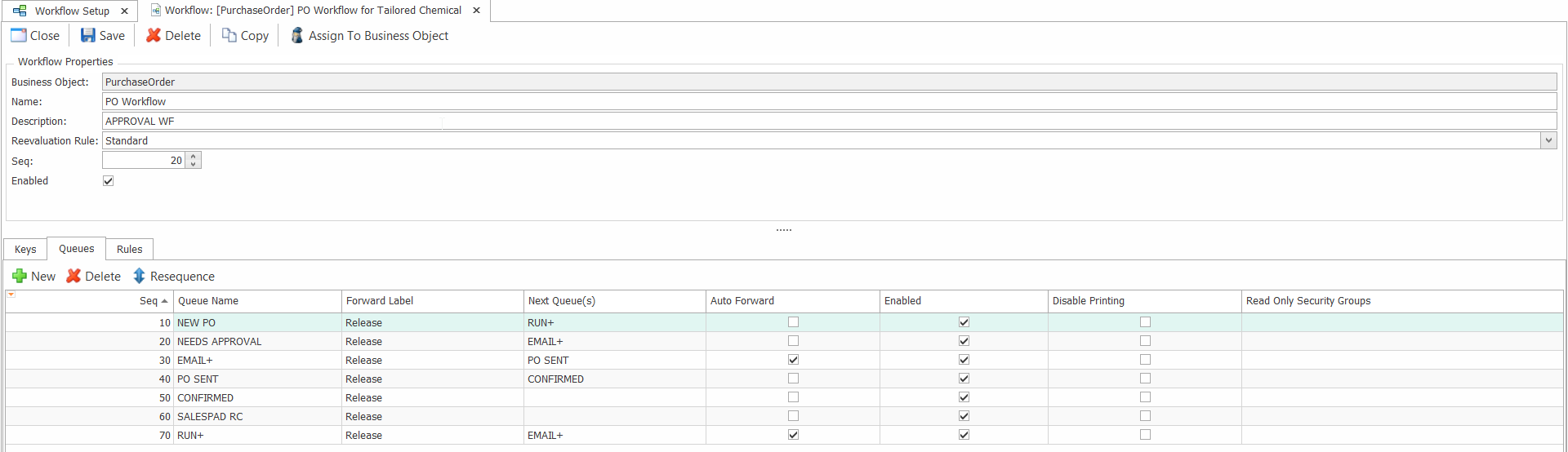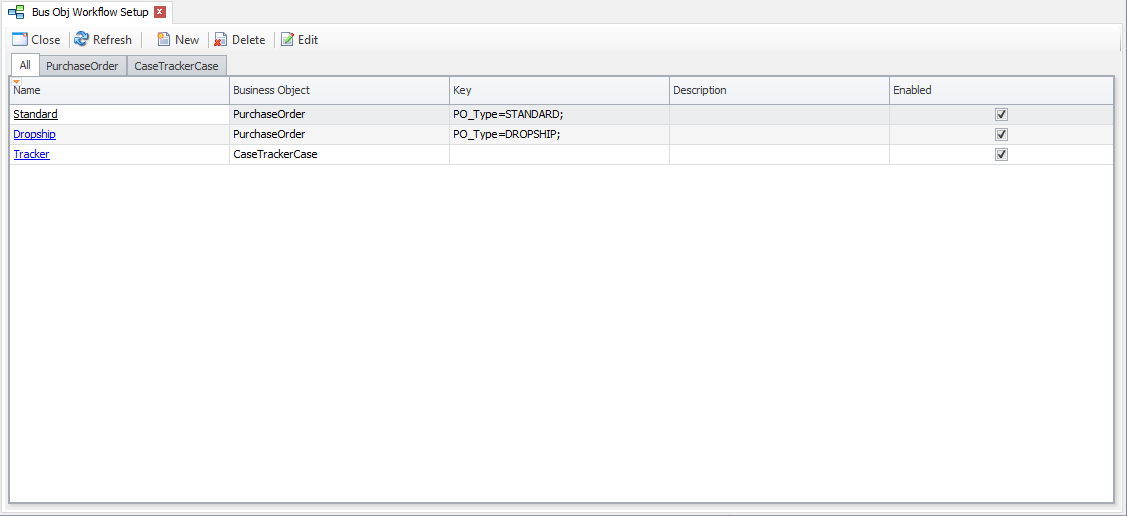 For example, a workflow key for the Purchase Order business object could be the PO Type field. Purchase order types in Dynamics GP are STANDARD, DROPSHIP, BLANKET, and DROPSHIPBLANKET. This means that theoretically four different workflows can be created for the Purchase Order business object. That being said, SalesPad currently supports only STANDARD and DROPSHIP types so two different workflows can be created.