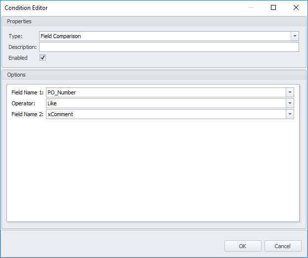 Field comparison condition compares a business object field (including user fields) to another business object field.
