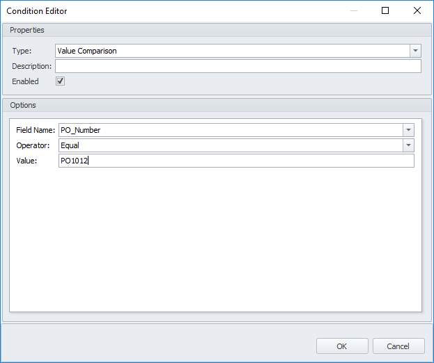 Value comparison condition compares a business object field (including user fields) to a static value.