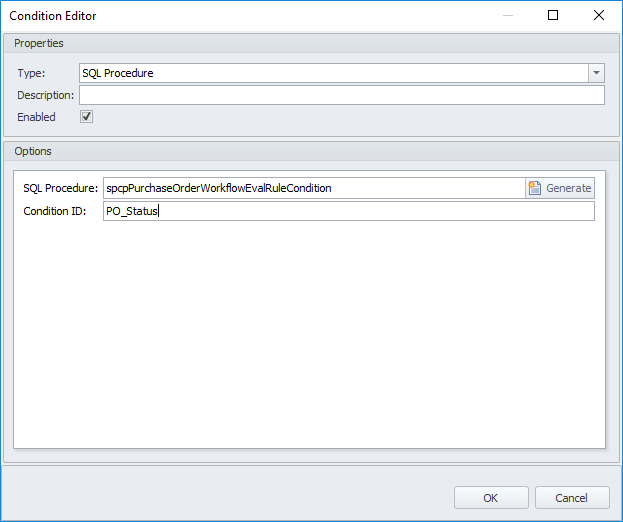 SQL procedure does not exist in the database by default, but clicking the Generate button will create it. For example, SQL procedure for CaseTrackerCase business object will be generated as spcpCaseTrackerCaseWorkflowEvalRuleCondition.