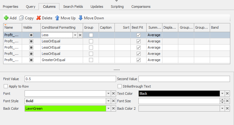 Condition - This is the value set in the Conditional Formatting column. Determines the comparison to evaluate to determine whether the appearance should be applied.