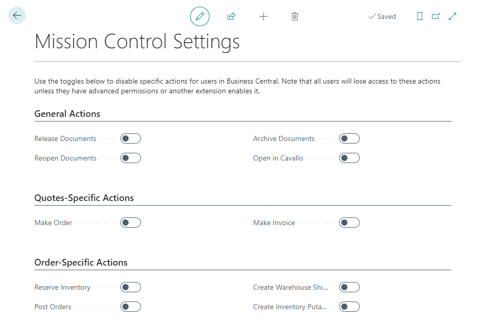 When any of the above toggles are enabled, the selected actions within Business Central will be hidden from users on sales documents and within any Mission Control screens. However, users with "Super" permissions or "Cavallo All Access" will still be able to view these actions, even if they are disabled. This ensures that admin users retain the ability to manually manage documents as needed.