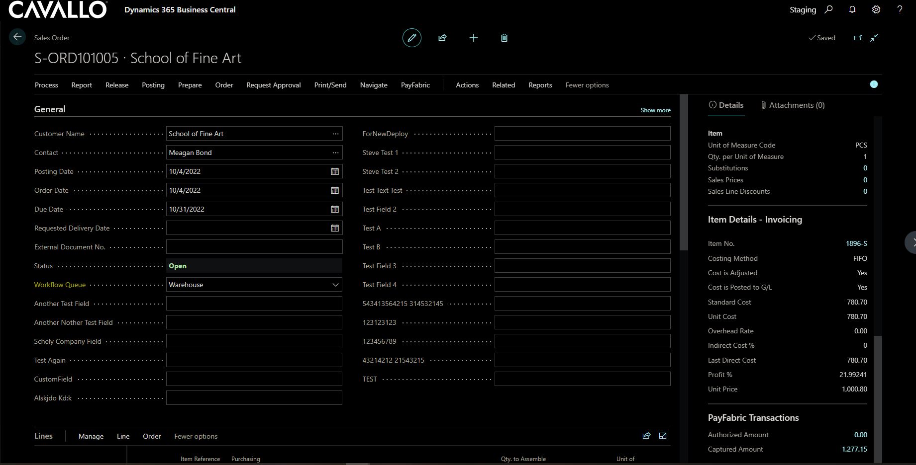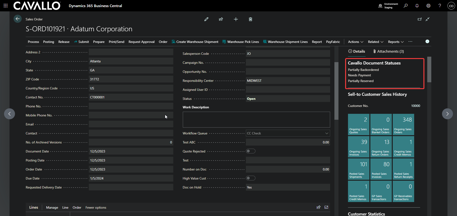 Cavallo has a number of custom statuses that have been built to ensure that documents are always on the correct workflow path. If users have the Cavallo API configured, the ability to view the Cavallo Document Status panel should be available on sales order search and the sales order cards.