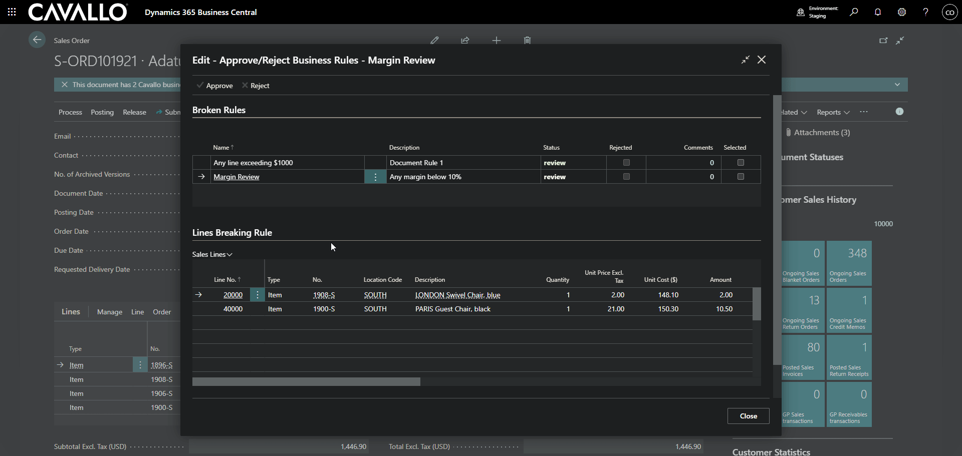 The approve or reject options are located in the Cavallo dropdown menu on the nav bar. A user can select an order from the document search, a line containing broken rules from sales line search or directly from the document itself in order to review for approval. Once the approve/reject option is selected, a pop up window will display the broken rules in addition to the lines that break each rule and allow a user to select the number of rules to approve. The approver may also add comments at this time and either approve or reject the rule(s).