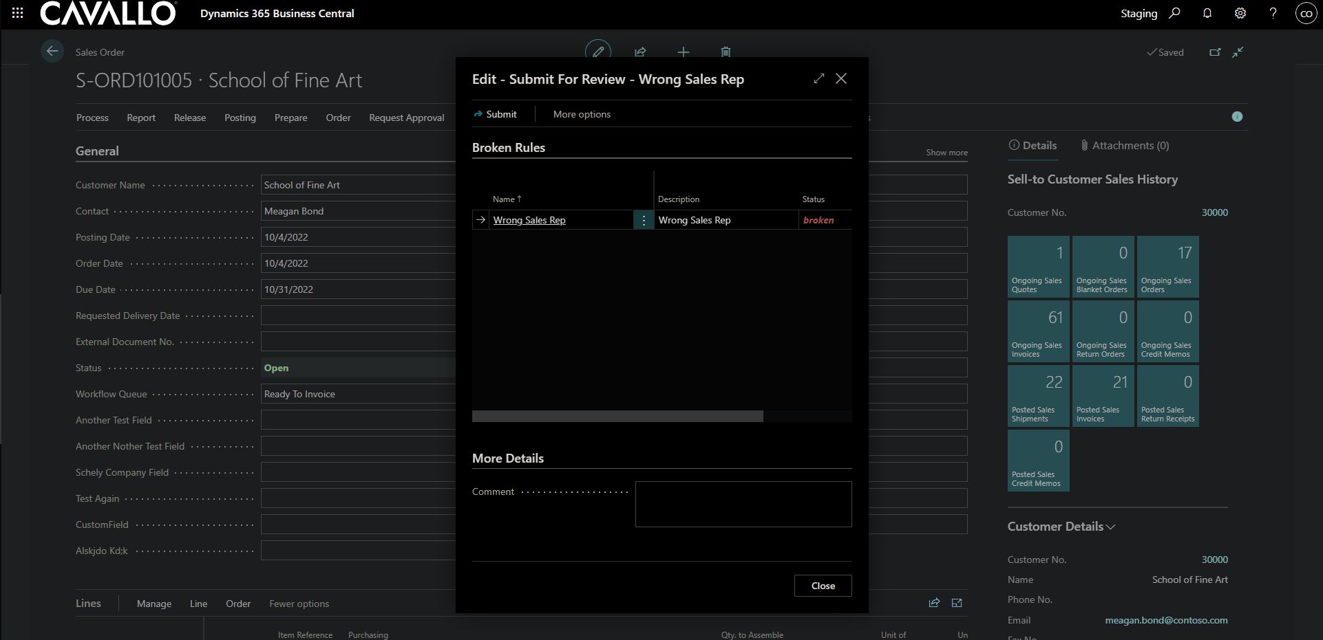 Once submitted, the "Workflow Queue" field in Business Central will update to reflect the broken rule and the document will be ready for approval or rejection.