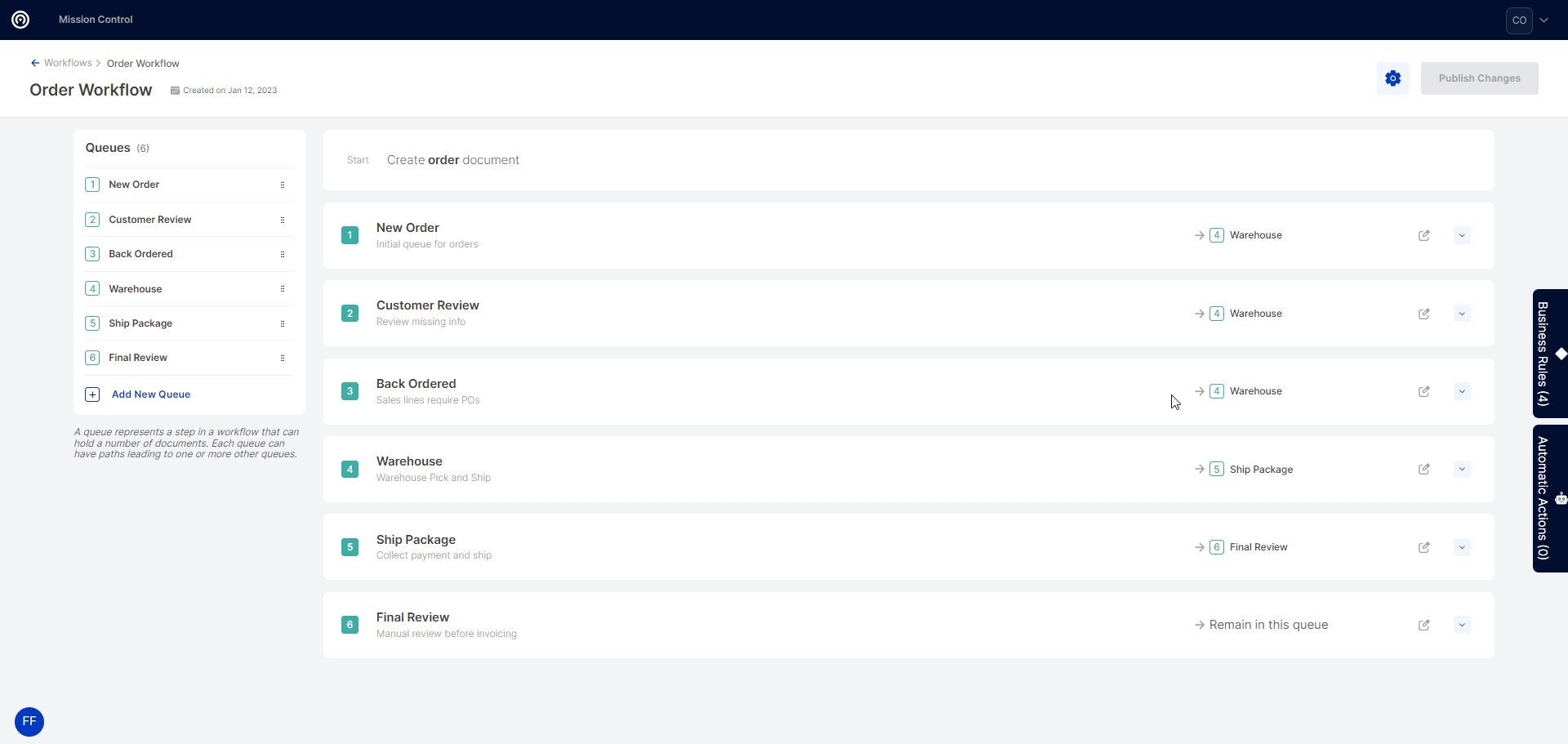 Once inside of the workflow builder for the selected document type, select the edit icon on the desired queue where the action should run. These actions can run either on entry or on exit from any given workflow queue.