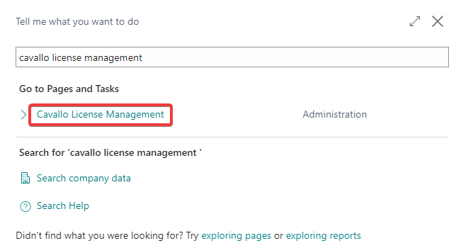 Step 2. Once the latest version is installed, navigate to the global search in Business Central and type "Cavallo License Management"