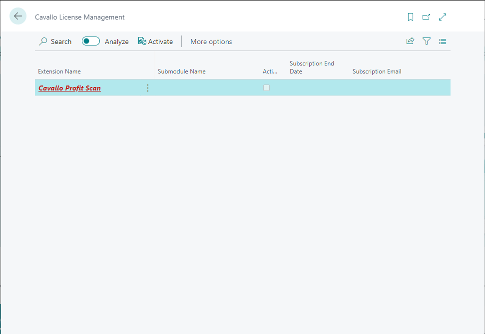 Step 3. The initial landing page will show the Cavallo Profit Scan extension name in a red color with an empty row. Clicking the "Activate" button will fetch the active license and enable all features within BC.
