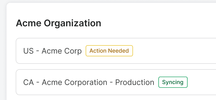 The last noticeable portion of this page is the status chip shown to the right of the company. These chips are present to visualize the status of a company from an onboarding perspective and users should expect these to update as a company progresses through the onboarding lifecycle. The rest of the document will go in depth on all of the above functions and their purpose from the company select screen.