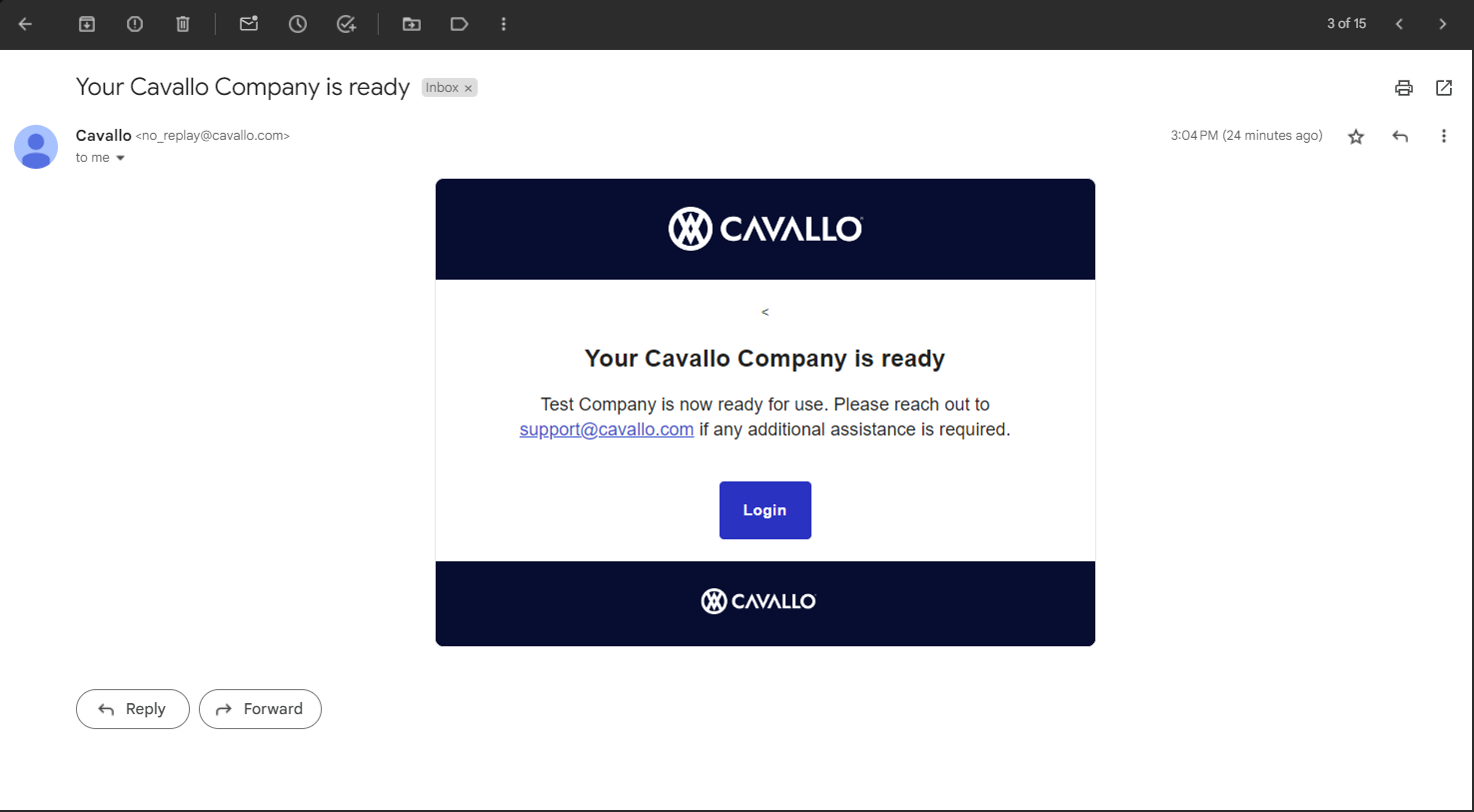 In the image above, a loading indicator is visible on the right product. This indicator appears if the data sync process from the company setup is still ongoing. Once the process is complete, an email will be sent to the user who onboarded the specific company to Cavallo. Below is the email template you can expect upon completion of the process: