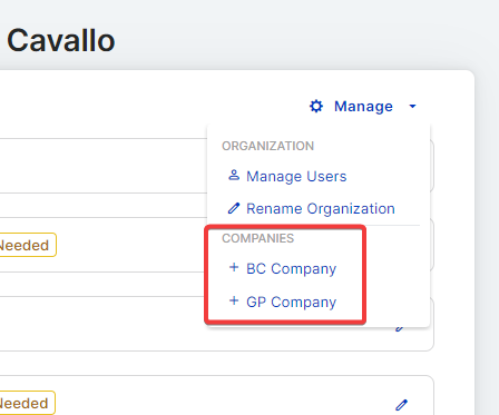 Users can onboard new companies to Cavallo products by using the "Manage" dropdown on the company select page. The dropdown will display all of Cavallo's current ERPs that our products connect to. By selecting an ERP from the dropdown, the user is brought into a fresh self-guided onboarding flow for that specific ERP. For exact instructions to follow for each of our flows, please visit the onboarding support document.