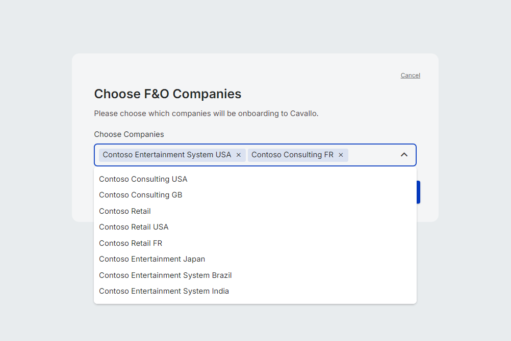 Once successfully logged into F&O, the next step will require users to select the companies they wish to onboard. This step is a multi-select and for each F&O company selected, a unique Profit Analytics company will be created.