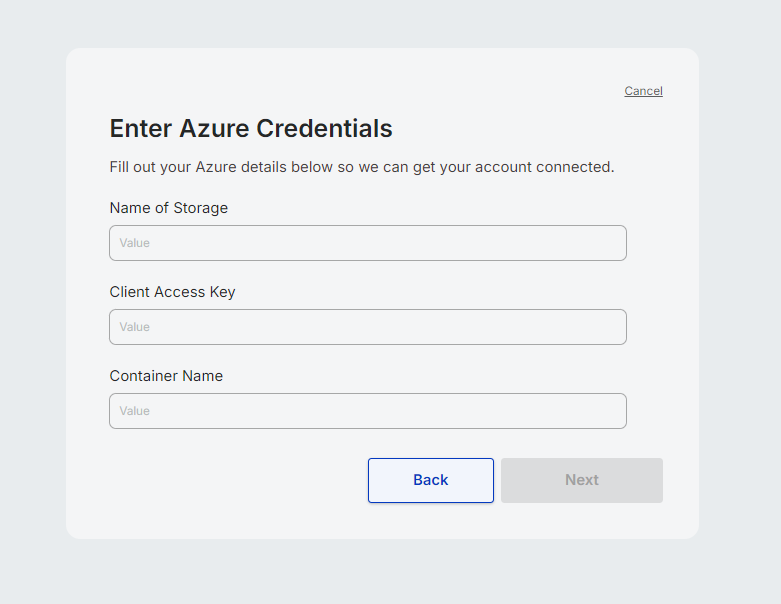 Step two of the onboarding process requires users to enter their pre-configured Azure credentials. All three fields must be filled out to proceed. Please note that Cavallo will validate the credentials upon clicking the "Next" button to ensure they are correct.