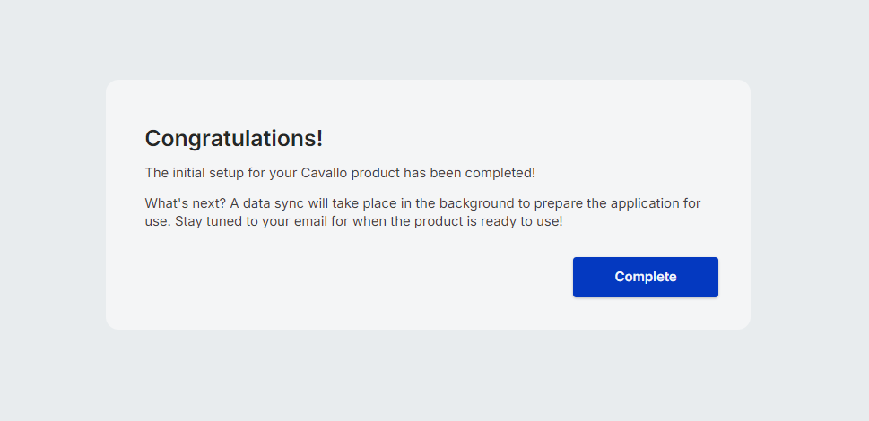 The onboarding flow concludes by informing users that a data sync will occur before they can begin using the product. This ensures all widgets are populated with data from the newly selected company. An email will be sent to the user who completed the onboarding to notify them when the product is ready for use. Please note that this process may take anywhere from a few hours to a few days, depending on the size of the data set. For any questions or concerns regarding this process, please contact support at support@cavallo.com.
