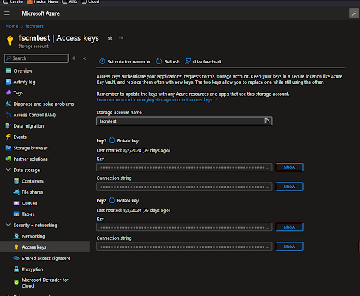 The last portion of setup is to retrieve the access key, storage name and container name. Below are images to show where these can be located within Azure