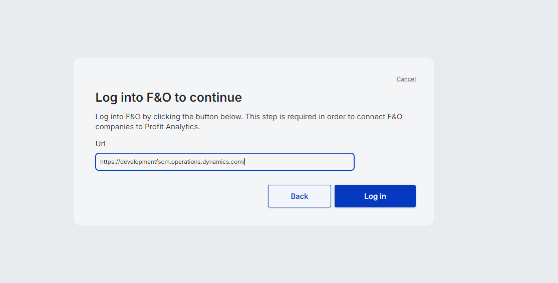 If the credentials provided are correct, users will proceed to step 3. In this step, they are required to copy and paste the F&O ERP URL they use daily to access the product. This allows Cavallo to redirect the user to Microsoft for login and retrieve all available companies for onboarding to Profit Analytics.