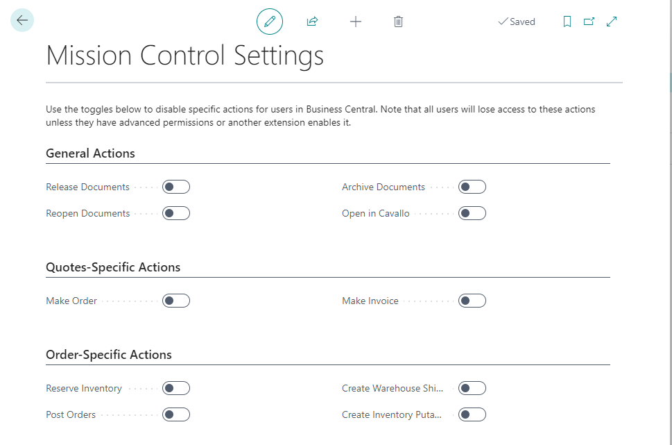 For all other users, once the toggles are set, they will lose visibility and the ability to take action on the selected items from the corresponding sales document cards, as well as from anywhere within the Cavallo Mission Control dashboards.